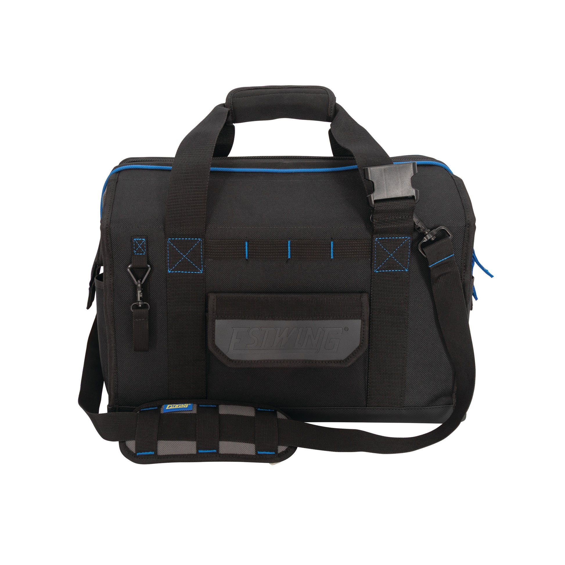 Built for demanding jobsite storage, the Estwing 42650 19-Inch Broad Mouth Tool Bag provides wide-open access to the full interior volume for easy loading of bulkier tools. The abrasion-resistant 1200-denier polyester body is reinforced with double-stitched binding and rigid PVC liners for structure without weight. A PVC-lined base with stabilizing feet protects against moisture. With 21 pockets, 25 tool loops, MOLLE-compatible exterior loops, bubble level sleeve, and buckle-closure compartment, this bag organizes tools of all types. Oversized grommeted zipper pulls allow for padlocking when securing tools is necessary. Includes a padded detachable shoulder strap.