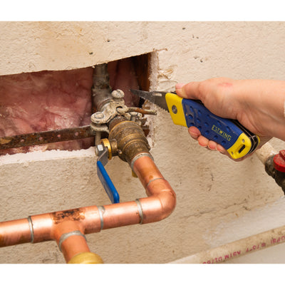 Designed to aid both the professional drywall installer and handyman as well as the DIY home improver, this tool from Estwing combines the best features of traditional utility knives with a specially designed secondary tool. The traditional style utility knife blade is held in a specialized chamber designed to automatically reload it with a fresh, sharp blade from the built-in storage compartment when a dull blade is removed. The compartment itself can store up to 3 replacement blades. All this with the operation of a single sliding, position locking button for quick use whether as a barely exposed box cutter or a fully deployed utility knife. The folding secondary blade is a stainless steel jab saw that is perfect for use cutting outlet holes, vent openings, and making custom contours in drywall gypsum board as well as for smaller woodworking and cabinetry work. A liner lock keeps the saw blade open during use for added operator safety. The ergonomic, dual durometer handle is fixed to a stainless steel frame and liner for lasting durability. Includes SK5 hardened steel, round corner carpet blades for convenience.