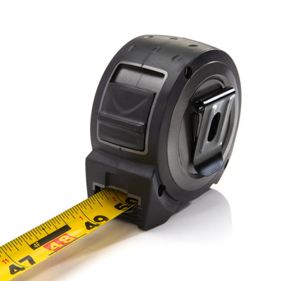 Get accurate measurements for cutting lumber, marking boards, and more with this double-sided tape measure. Designed with a stiffened 1-1/16-inch wide blade, this measuring tool is able to provide an impressive 9-feet of standout to make taking measurements solo even easier. The standard sliding lock is augmented with a finger brake that allows you to temporarily hold the tape at length as well as slow down retractions for added safety. The oversized end hooks allow both over and under attachment and the double-sided printing on the blade makes it easy to get an accurate read. A magnet mounted to the end hook attaches easy to metal surfaces, enabling measurements to be taken while solo, even when there isn't an anchor point available. A convenient metal belt clip on the back of the tape attaches easily to tool belts, pockets, and pouches for easy carrying and transport while leaving the tool always quick to hand. Built to handle drops, impacts and bumps, the tape's rubber overmold helps it stand up to the most heavy-duty of use.