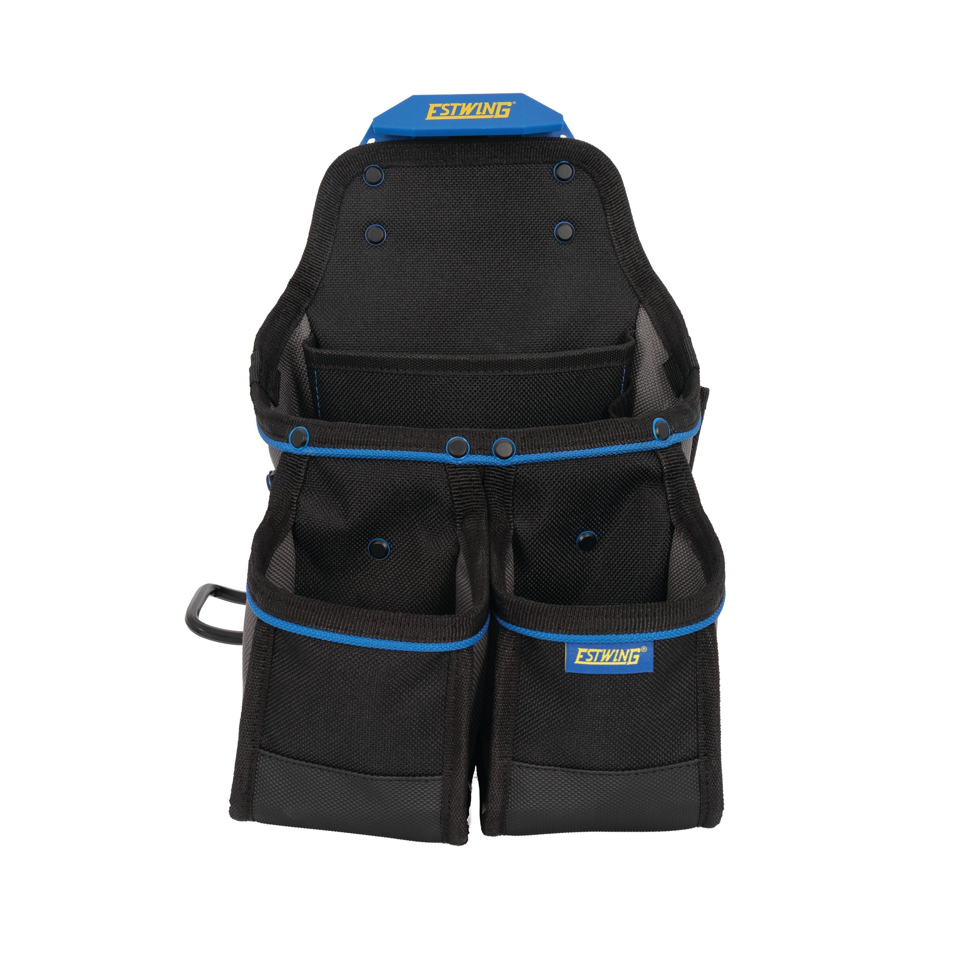 Designed for professional tradespeople, the Estwing 42653 3-Piece Tradesman Set provides rugged storage and modular flexibility. Made from 1200-denier polyester with reinforced stress points and PVC inserts, the set includes two large kickstand pouches and a dual-layer adjustable belt with breathable 3-inch padded interior. With 5 steel D-rings for suspenders and the Estwing PROLOCK™ quick-release system, users can customize pouch layout quickly. The set offers 34 total compartments for fasteners, hand tools, and accessories. Includes two PROLOCK™ mounting clips.
