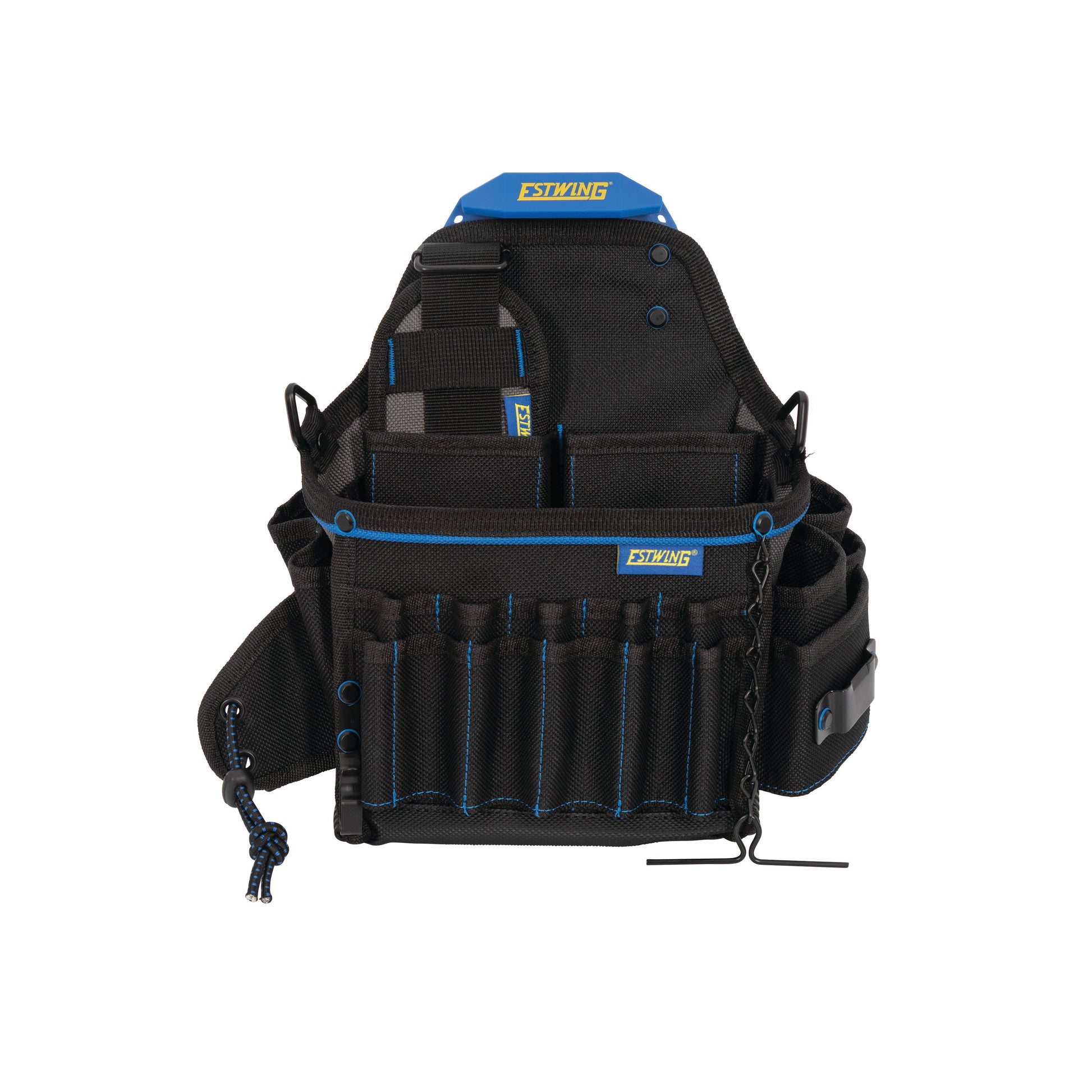 Built for electrical professionals, the Estwing 42625 Electrician Pouch with Tape Chain keeps specialized tools organized and accessible. Constructed from rugged 1200-denier polyester with rivet-reinforced stress points and protective rubberized binding feet, this pouch attaches securely to any PROLOCK™ quick-release clip for versatile use. A spacious main pocket and 27 loops and compartments organize screwdrivers, pliers, crimpers, testers, and wire strippers. Features include an adjustable flashlight holder, steel tape-measure clip, spring clip for wrenches, and a rivet-anchored tape chain for multiple rolls of electrical tape. A folding kickstand allows freestanding use, and a PVC-reinforced base protects against moisture and abrasion. Includes a detachable shoulder strap and one steel PROLOCK™ quick-release mounting clip.
