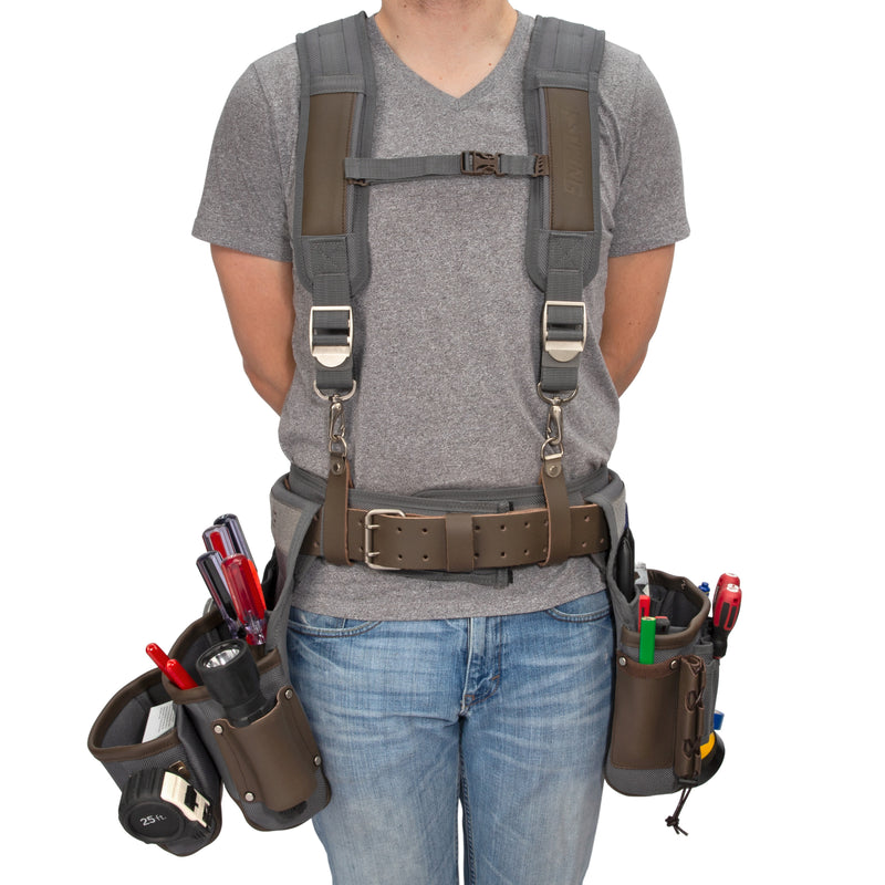 This Estwing electrician's tool rig has multiple large, open pockets to let you carry the tools you need to get your work done. Made from a combination of rugged 1800D polyester and top grain leather, this rig supplies you with a total of 13 large and small pockets to store a variety of screws, nails, tools, and more. Additional storage includes several tool loops to store screw and bit drivers, an adjustable flashlight loop, a steel electrical tape chain, a steel hammer holder, a tape measure clip, and a large, wet-molded leather tool loop. Rivet-reinforced stress points provide additional support to the heavy-duty bar-tack stitching and to help when supporting heavy loads the rig includes removable 5-point padded suspenders. The leather belt has a steel, double-tongue roller buckle and slides through a wide padded liner made with cooling mesh to provide day long comfort and fit on waist sizes of 30 to 52-inches.