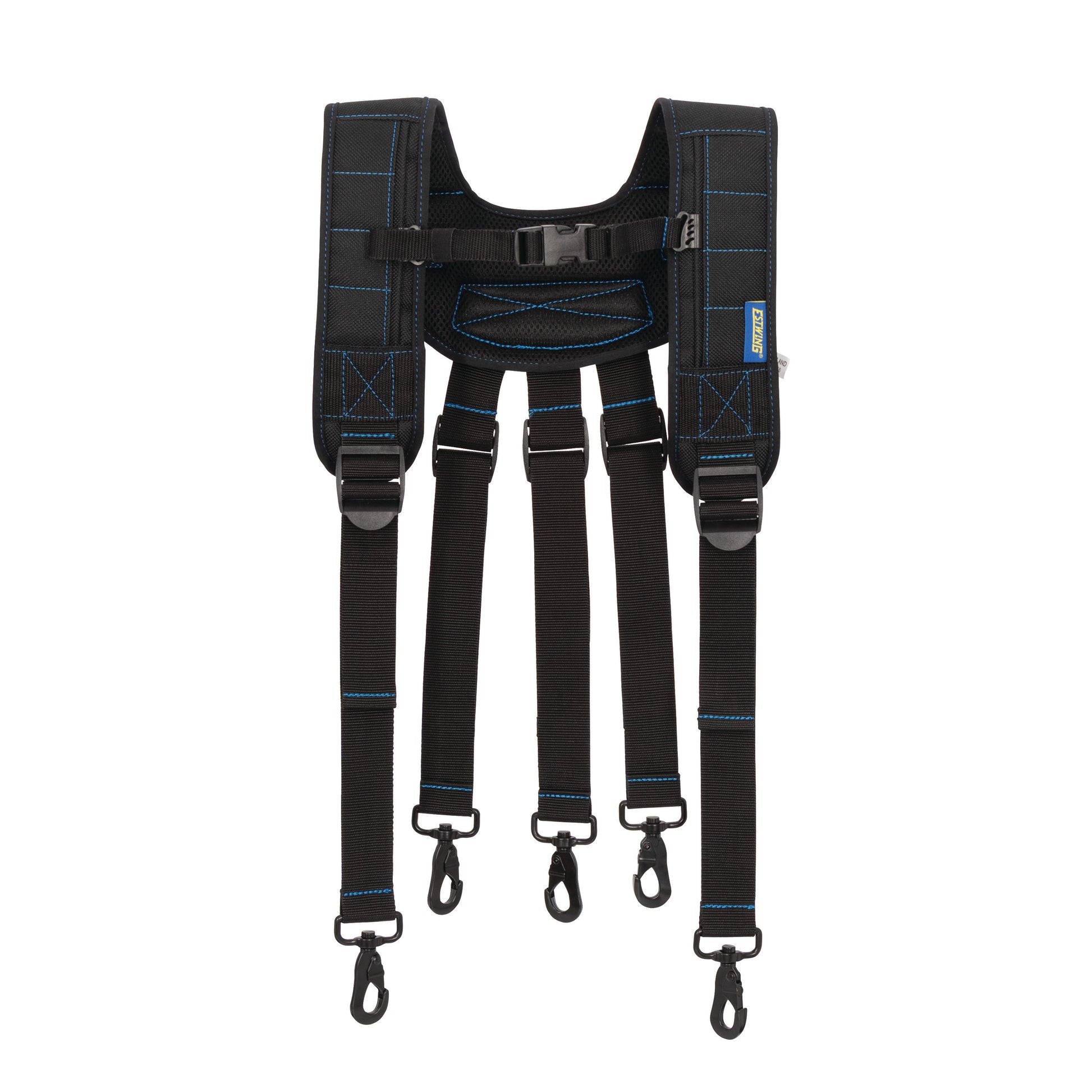 Designed to reduce strain from heavy tool belts, the Estwing 42646 Padded Work Belt Suspenders provide balanced weight distribution through a padded, breathable mesh shoulder system and five adjustable 1.5-inch straps. Nickel-plated steel snap hooks attach easily to Estwing padded belts and most belts with suspender anchors. An adjustable sternum strap prevents strap separation, and MOLLE-style loops on each shoulder strap allow attachment of Estwing PROLOCK™ pouches and accessories.