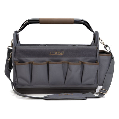 This easily portable 18-inch Estwing professional tool tote helps carry the tools you need to get work done. This bag is made with rugged 1800D polyester fabric that can hold up to long, hard use on the most demanding job sites. The outside of the bag sports 5 open top pockets, a neoprene self-closing fastener pouch, a zipper secured pocket for small tools and items, a rivet secured steel tape measure clip, and a tension secured hammer holder to provide additional exterior storage. The main compartment has a pair of hook-and-loop secured dividers that can be removed to allow for easier carrying of larger power tools and bulky saws or adjusted to create custom tool storage. The interior floor of the bag is made from a single piece of puncture resistant polyethylene (PE) to keep saw blades and other sharp tools from piercing through the bottom of the tote. Lining the inside are 6 pockets to further help organize stored tools. The outside bottom of the bag also features a hard plastic boot that provides a stable base when the bag is set down while also adding durability and moisture resistance. The included padded shoulder strap features durable steel hardware and makes a convenient way to transport tools to and from the job site.